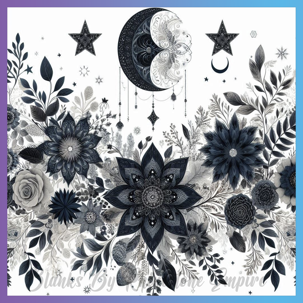Theme: Flower with moon, stars, leaves, black.