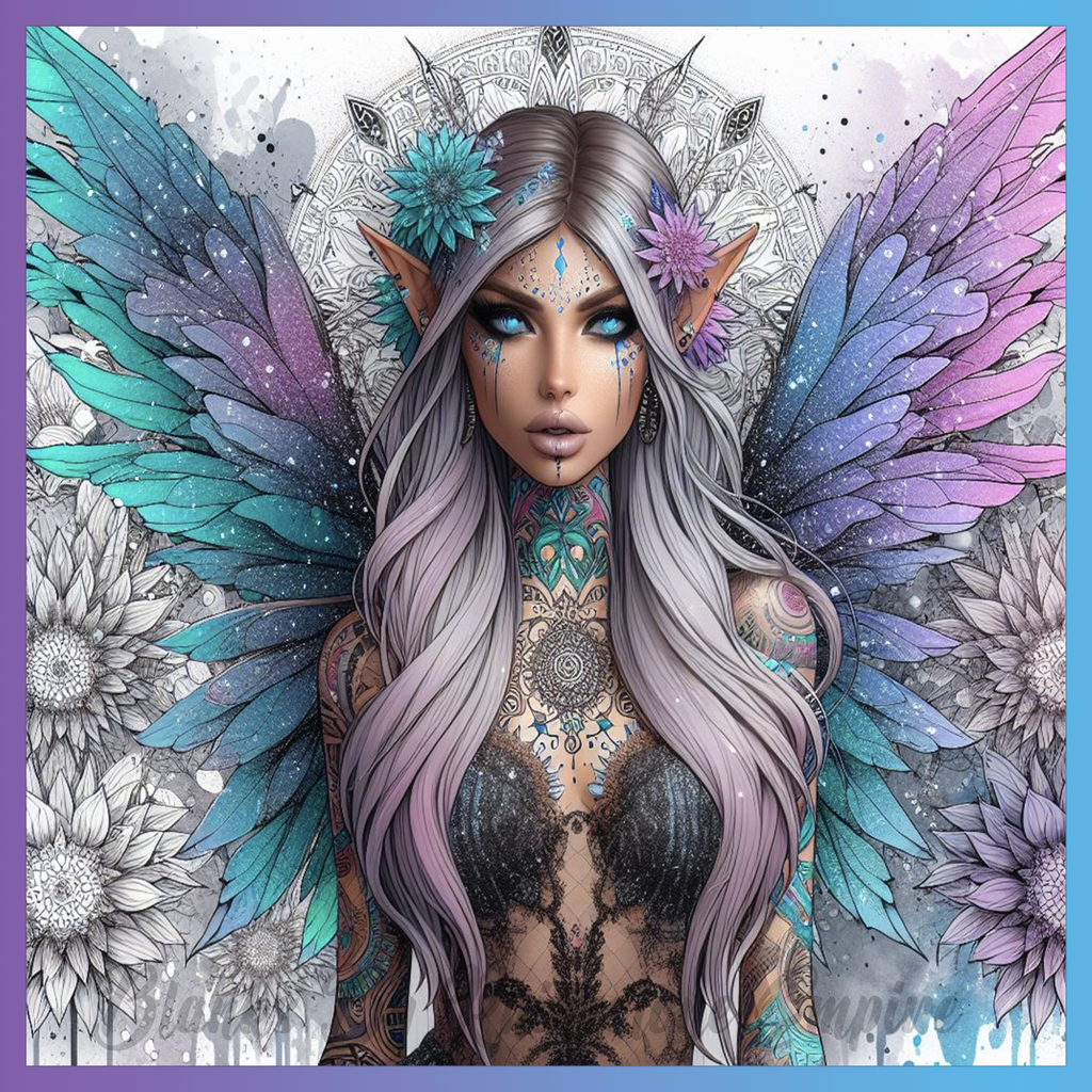 Theme: Girl with fairy, wings, tattoo, flowers.