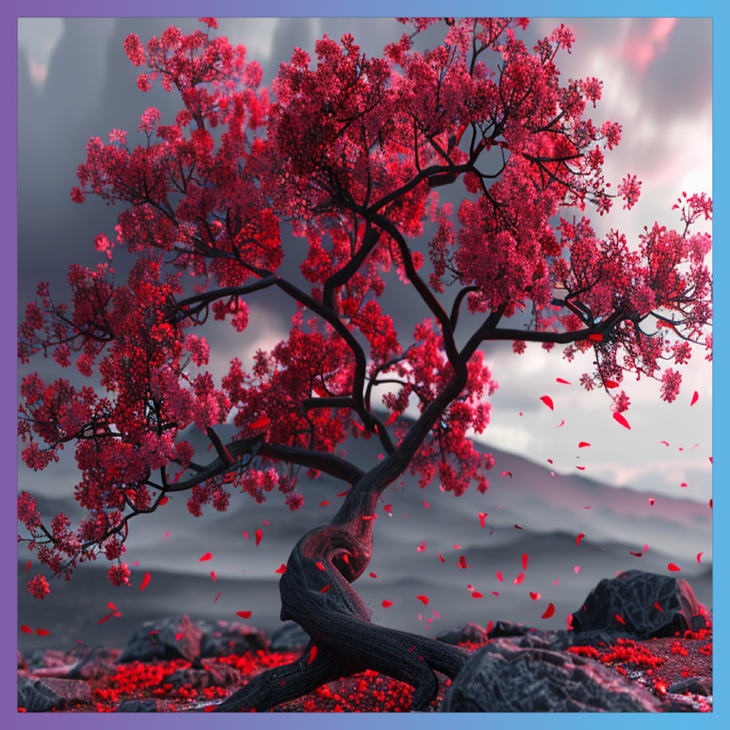 Theme: Tree with red, blossoms, petals, rocks.
