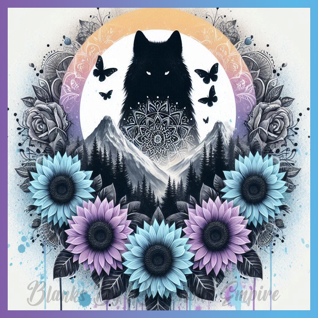 Theme: Wolf with mountains, butterflies, flowers, mandala.