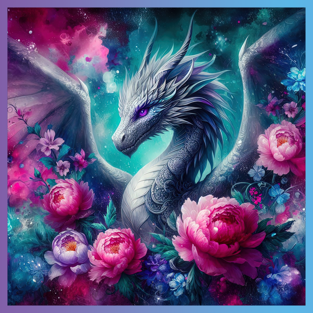 Theme: Dragon with flowers, colorful, fantasy, wings.