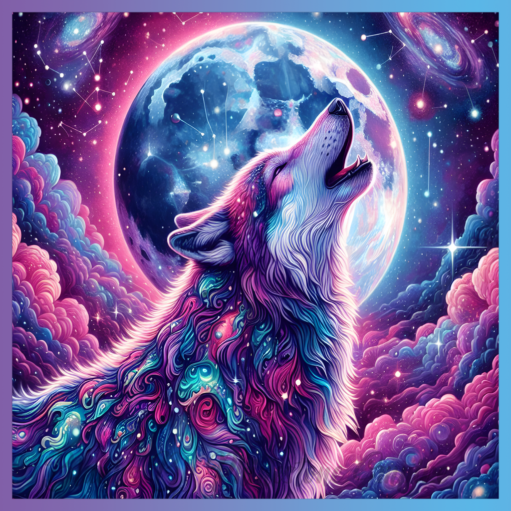 Theme: Wolf with howling, moon, galaxy, colorful.