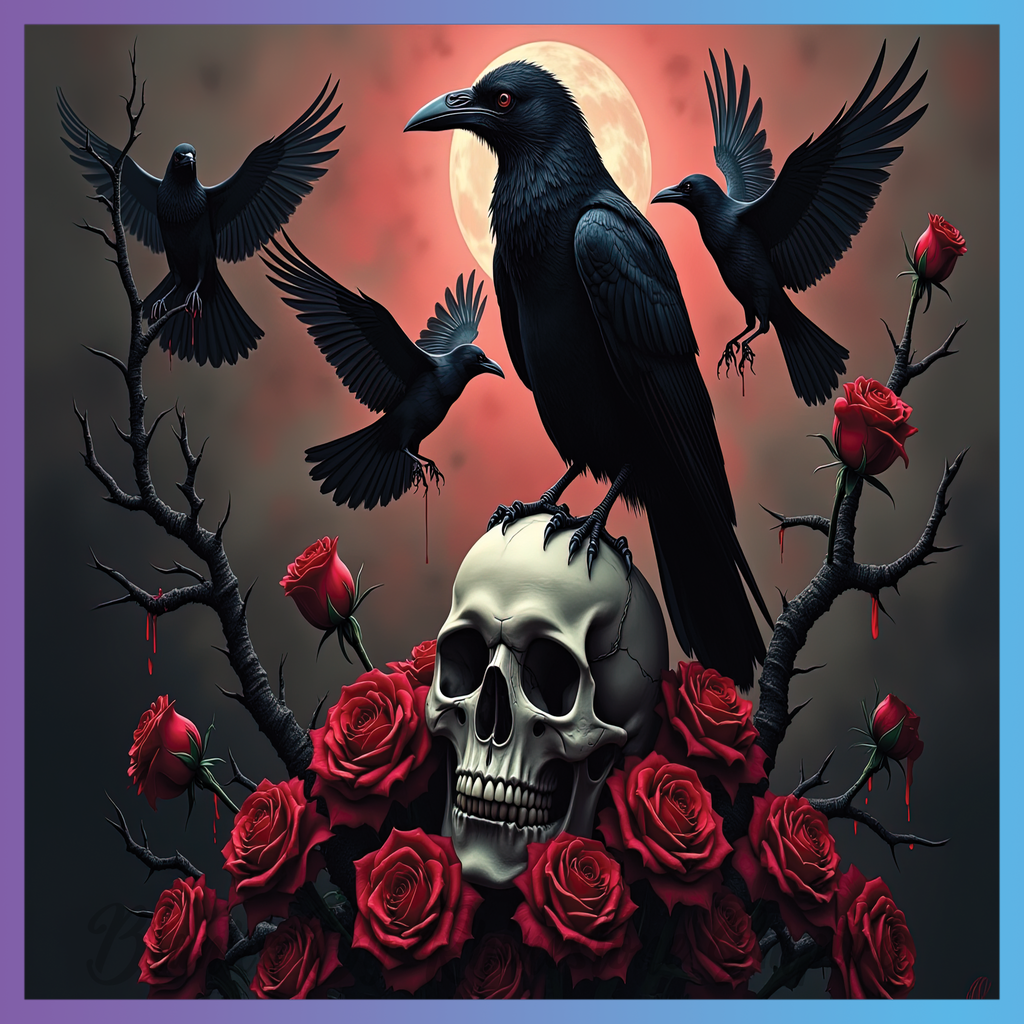 Theme: Skull with crows, roses, moon, dark.