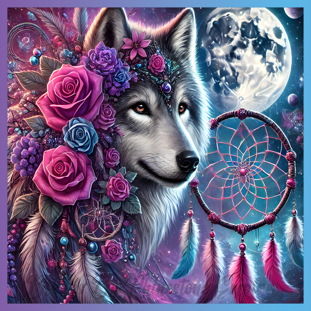 Theme: Wolf with flowers, dreamcatcher, moon, cosmic.