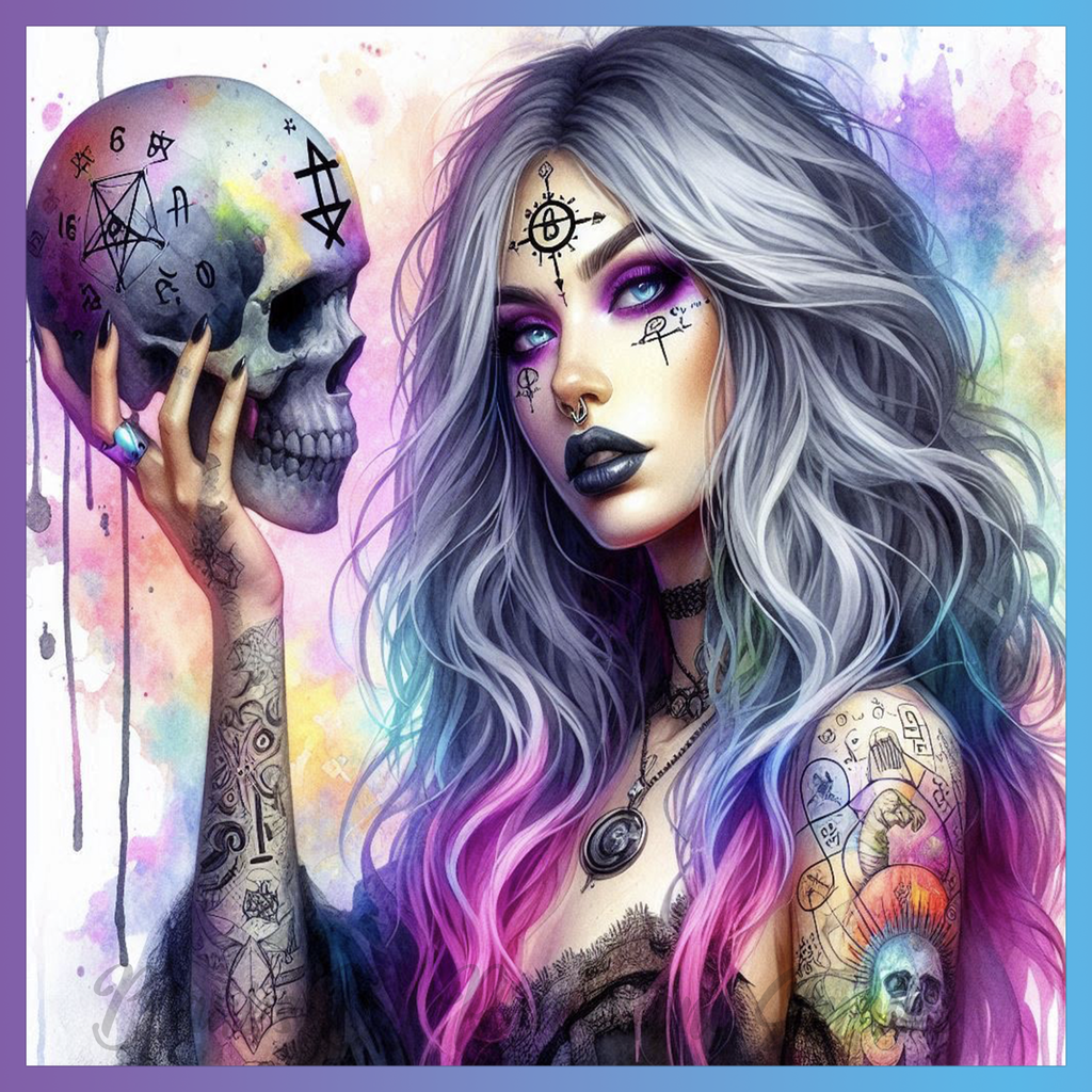 Theme: Girl with skull, tattoo, colorful, hair.