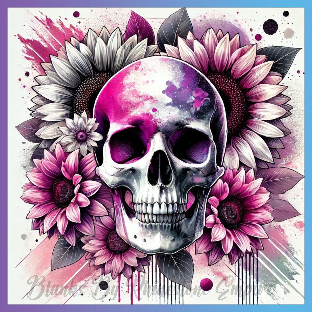 Theme: Skull with flowers, sunflowers, colorful, art.