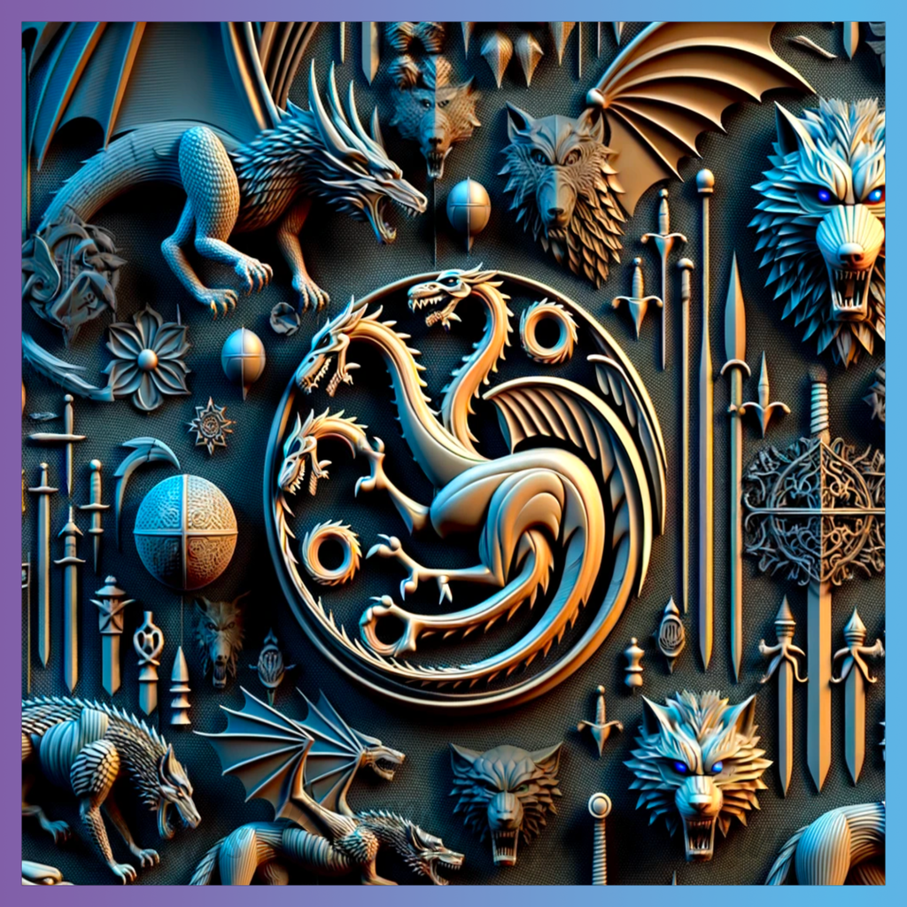 Theme: Dragon with mythical, creatures, swords, shields.