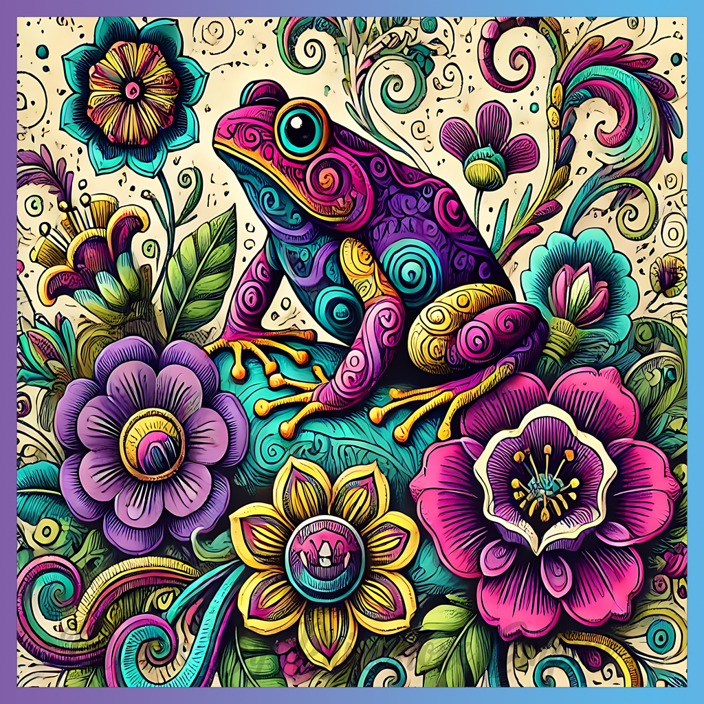 Theme: Frog with colorful, flowers, swirls, nature.