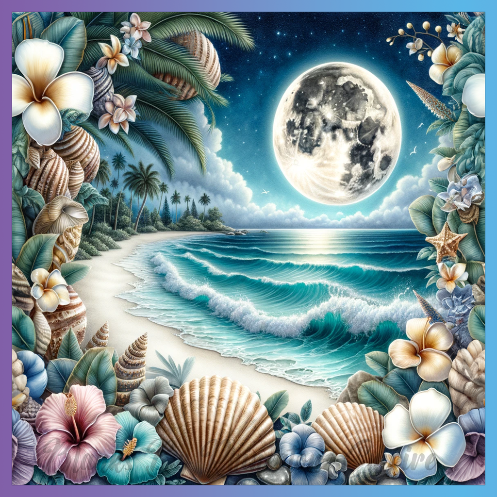 Theme: Moon with beach, ocean, waves, palm trees.