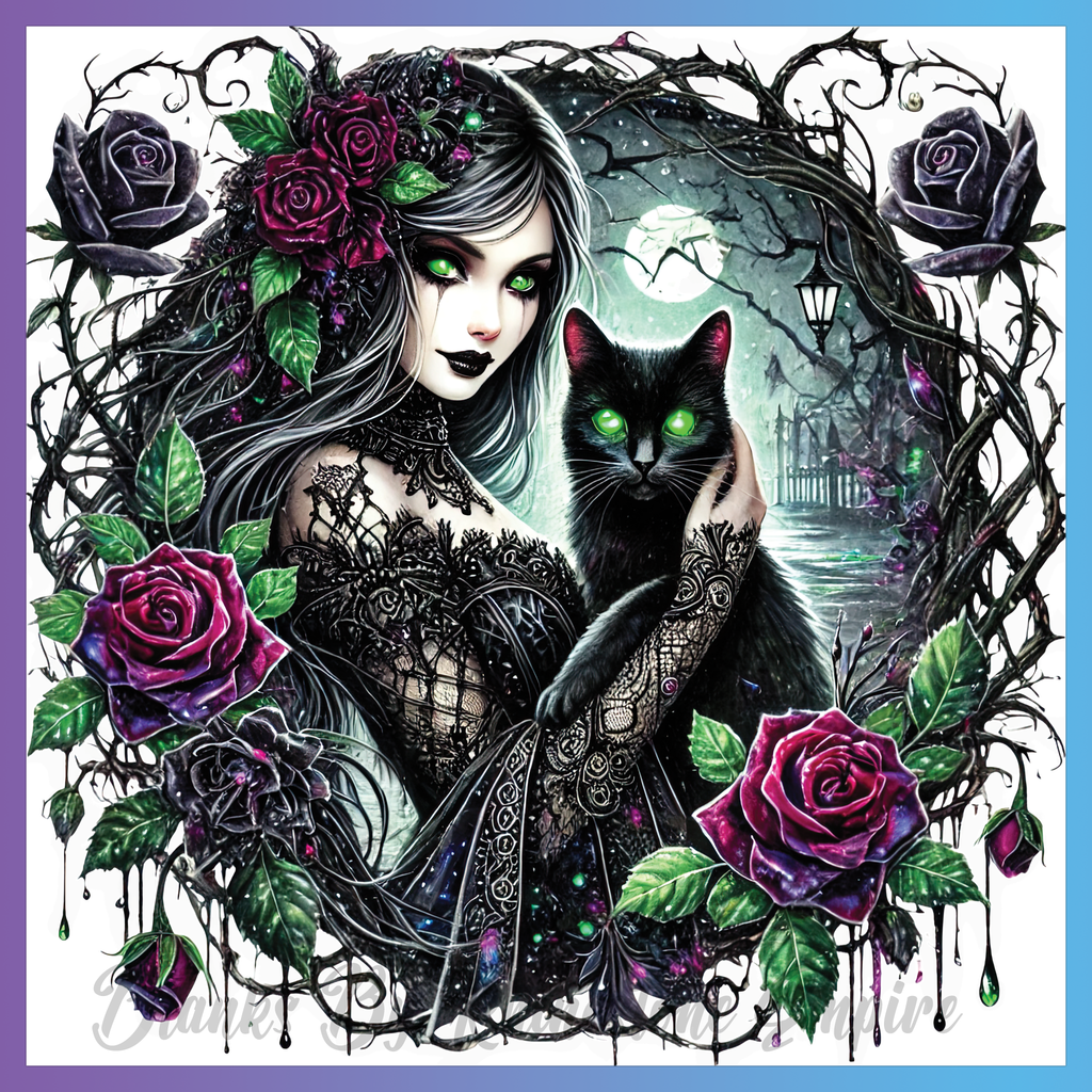 Theme: Girl with gothic, black cat, roses, moonlight.