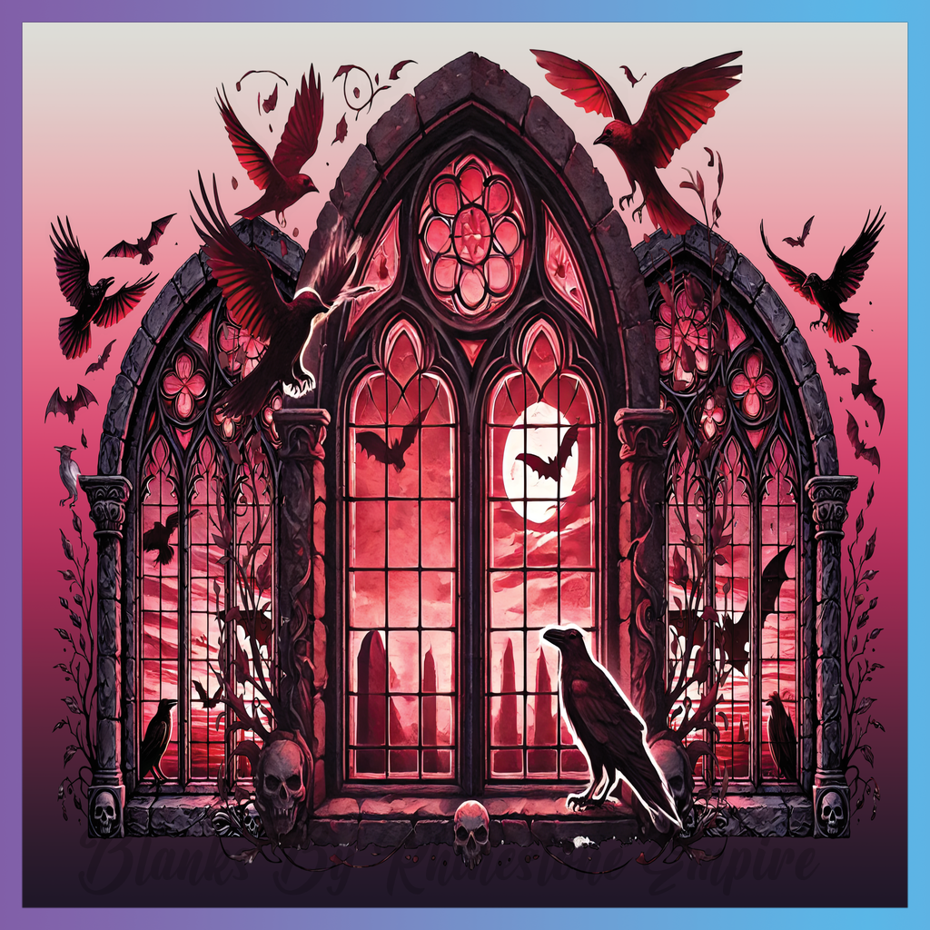 Theme: Window with gothic, crows, bats, skulls.