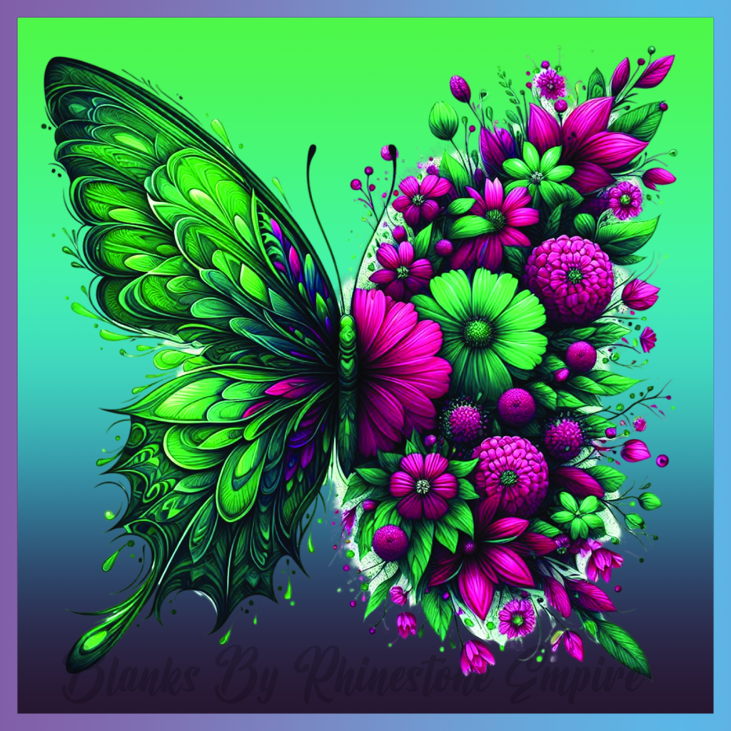 Theme: Butterfly with flowers, green, purple, detailed.