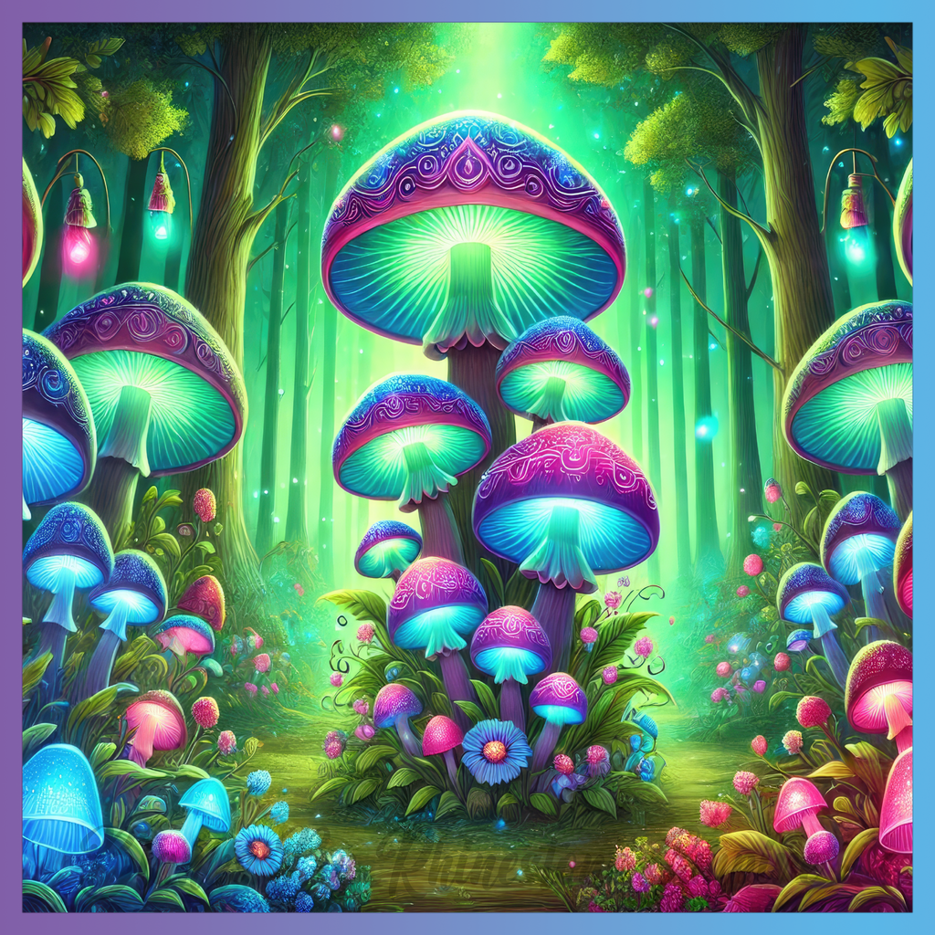 Theme: Mushroom with glowing, forest, colorful, fantasy.