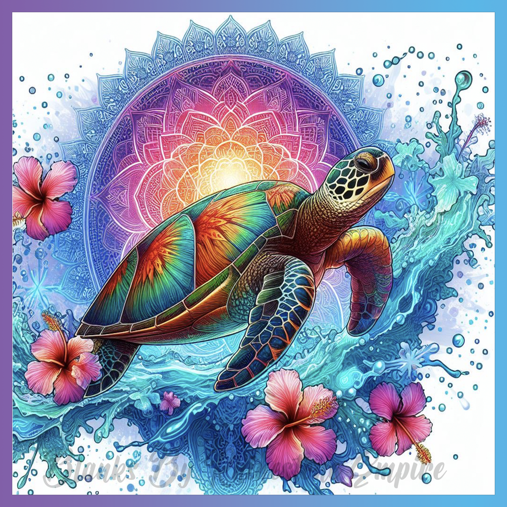Theme: Turtle with water, flowers, mandala, colorful.