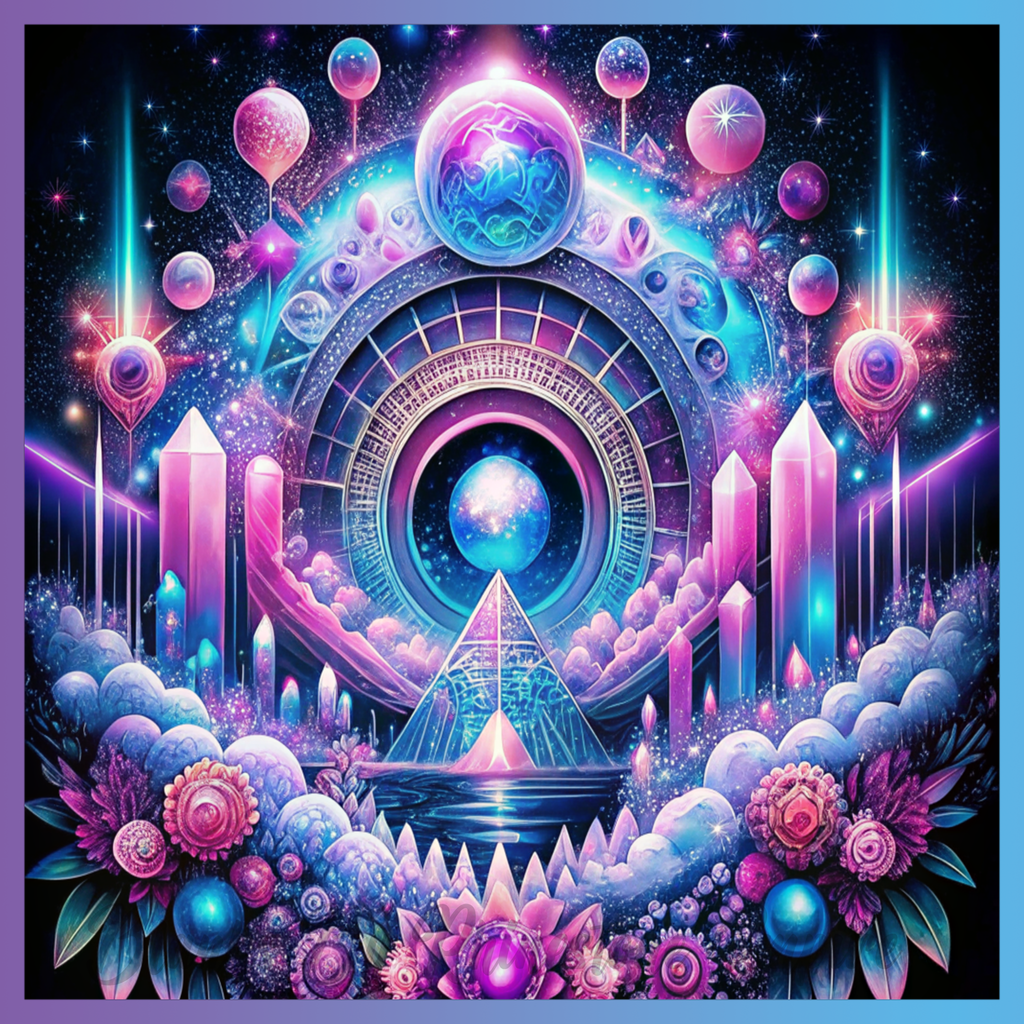 Theme: Pyramid with cosmic, crystals, flowers, planets.