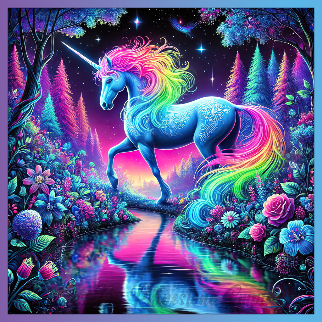 Theme: Unicorn with rainbow, forest, flowers, river.