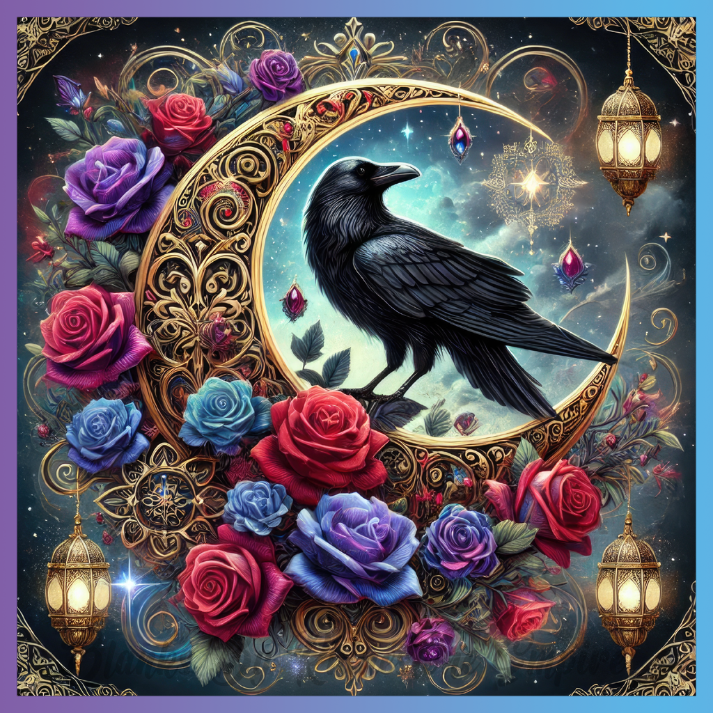 Theme: Raven with moon, roses, ornate, lanterns.