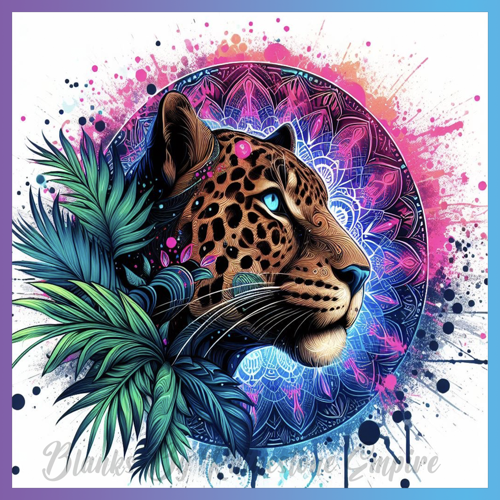 Theme: Leopard with colorful, mandala, tropical, leaves.