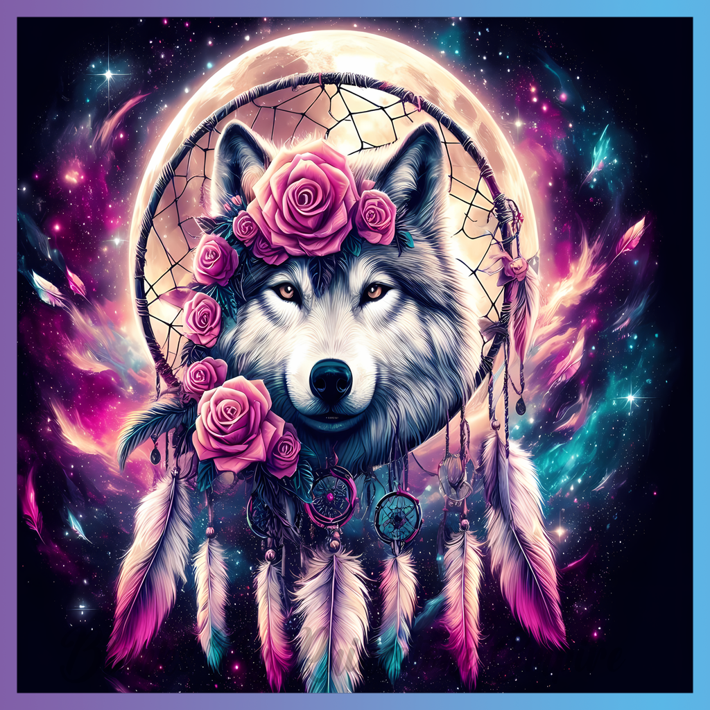 Theme: Wolf with dreamcatcher, roses, moon, feathers.
