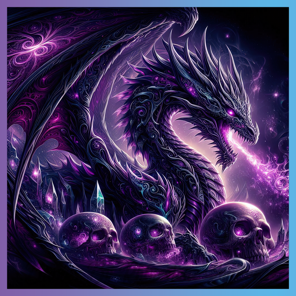 Theme: Dragon with skulls, purple, fantasy, fire.