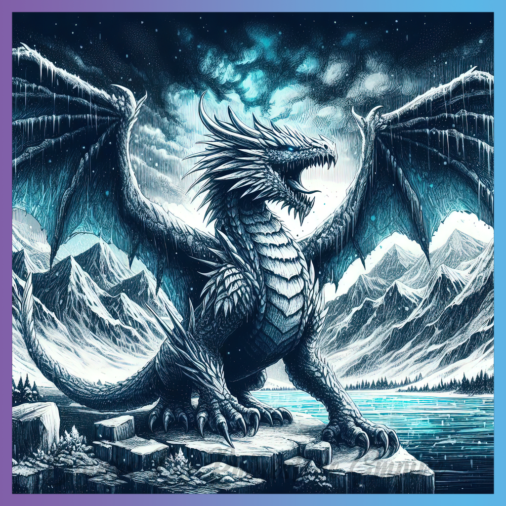 Theme: Dragon with mountains, lake, ice, wings.