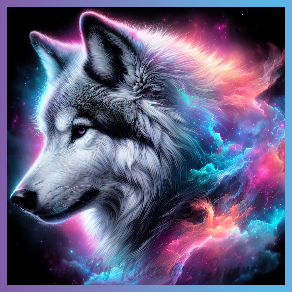 Theme: Wolf with cosmic, colorful, fur, space.