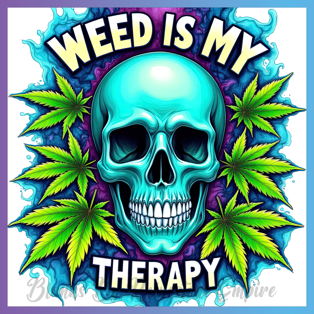 Theme: Skull with cannabis, colorful, graphic, text.