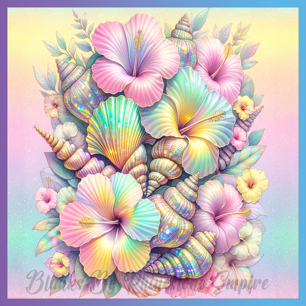 Theme: Flower with hibiscus, seashells, pastel, vibrant.