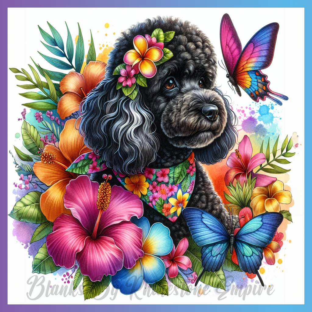 Theme: Dog with flowers, butterflies, colorful, tropical.