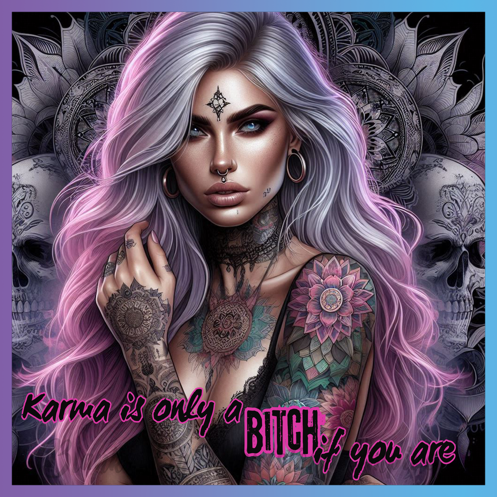 Theme: Girl with tattoo, skull, flowers, purple hair.