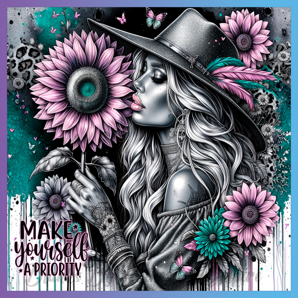 Theme: Girl with tattoo, sunflower, hat, flowers.