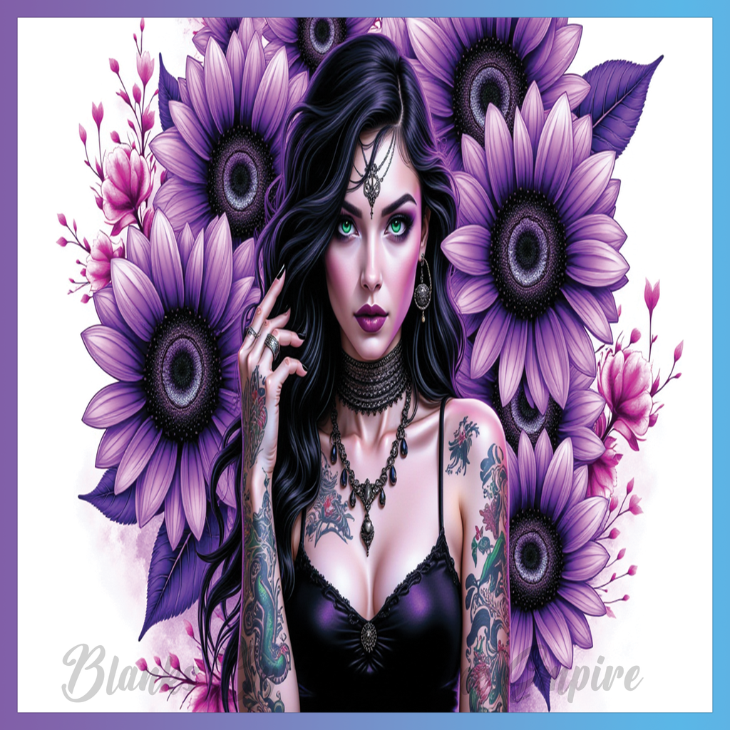 Theme: Girl with tattoo, flowers, purple, jewelry.