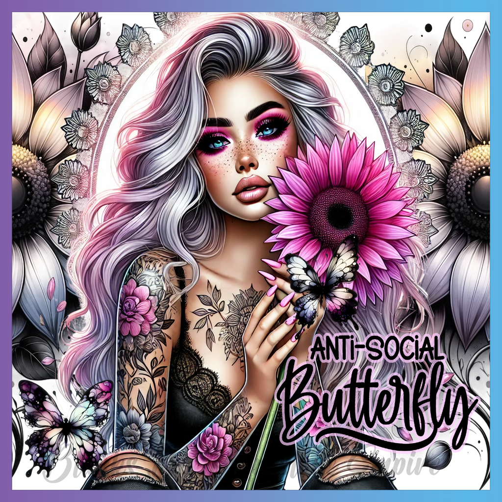 Theme: Girl with tattoo, flowers, butterflies, portrait.