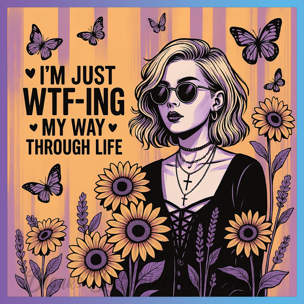 Theme: Girl with sunglasses, butterflies, sunflowers, purple.