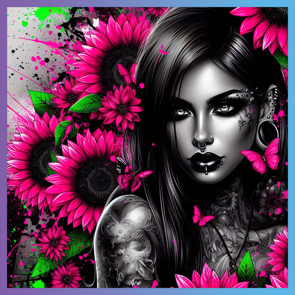 Theme: Girl with tattoo, flowers, butterflies, black and white.