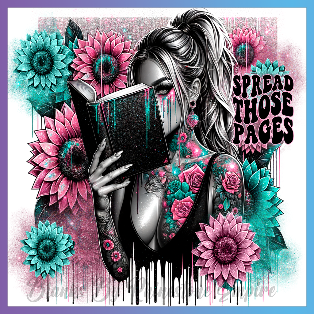 Theme: Girl with tattoo, book, flowers, colorful.