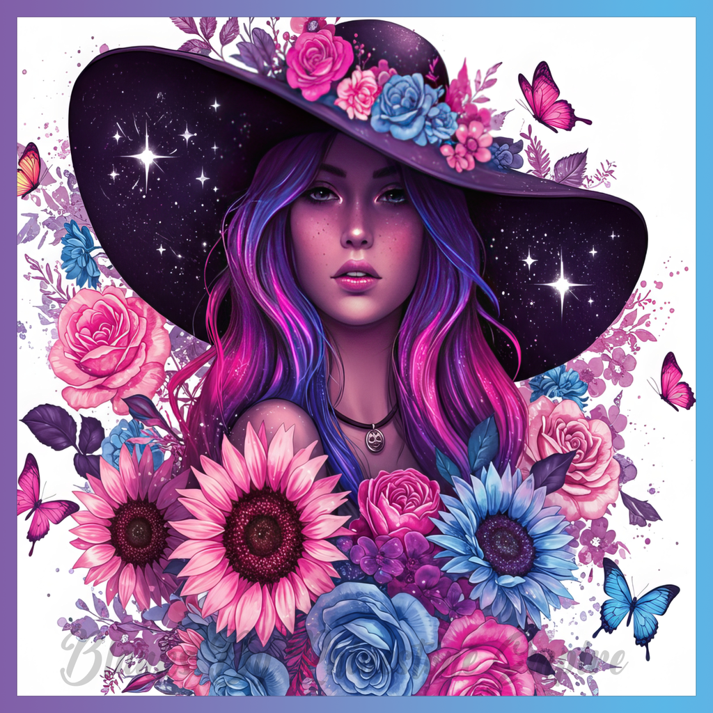 Theme: Girl with hat, flowers, butterflies, colorful.