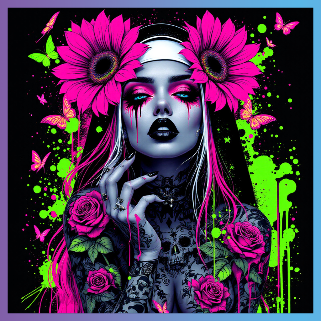 Theme: Girl with tattoo, flowers, butterflies, colorful.