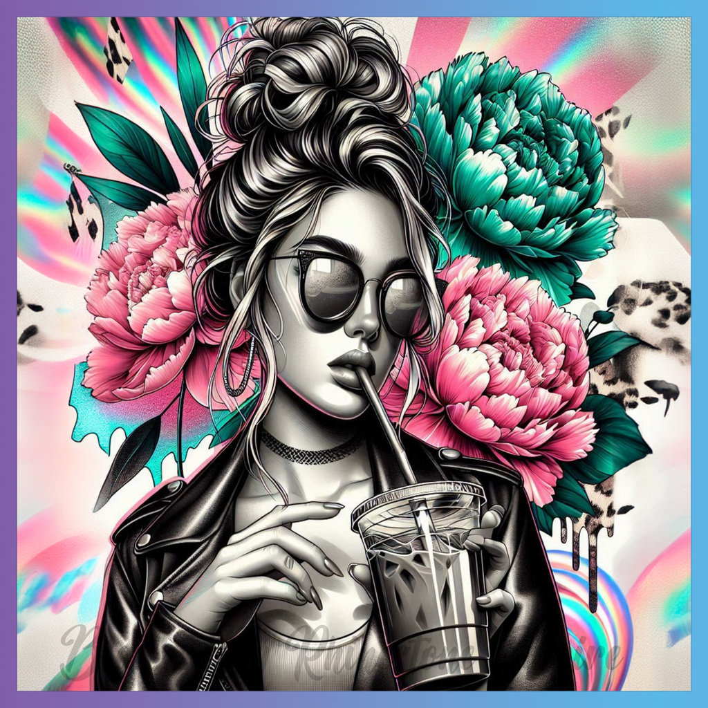 Theme: Girl with sunglasses, drink, flowers, leather jacket.