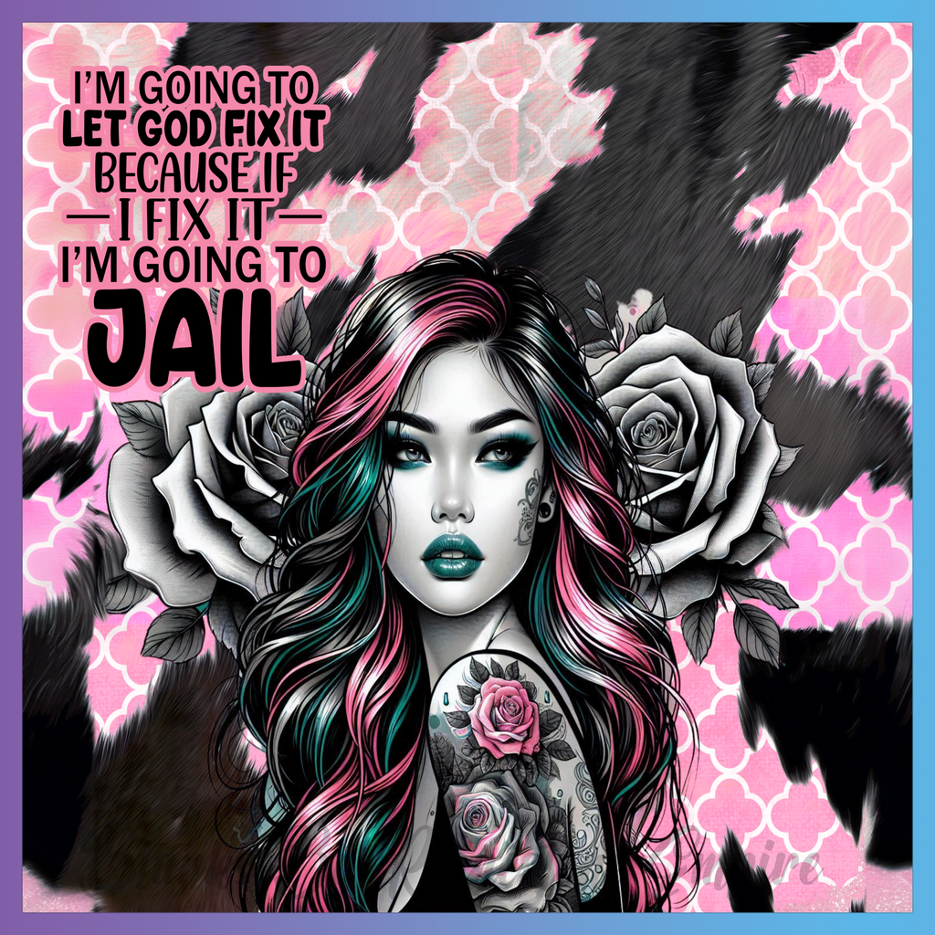 Theme: Girl with tattoo, roses, pink hair, text.