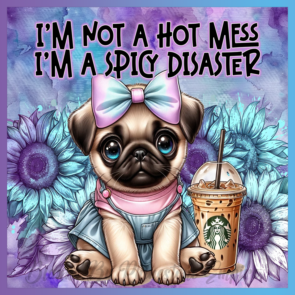 Theme: Pug with cute, cartoon, flowers, beverage.