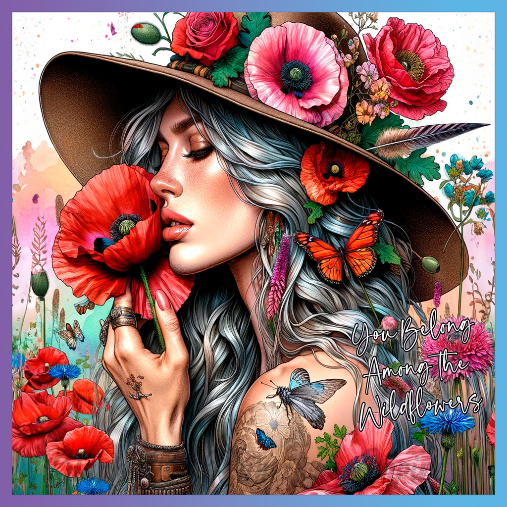 Theme: Girl with flowers, butterflies, hat, tattoo.