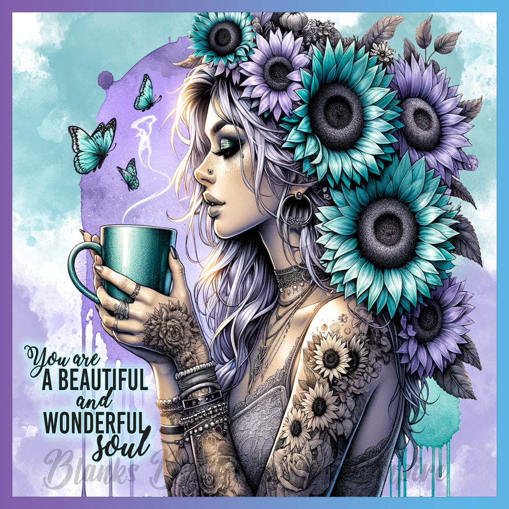 Theme: Girl with tattoo, flowers, butterflies, cup.