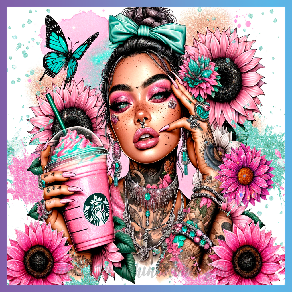 Theme: Girl with tattoo, flowers, butterfly, drink.