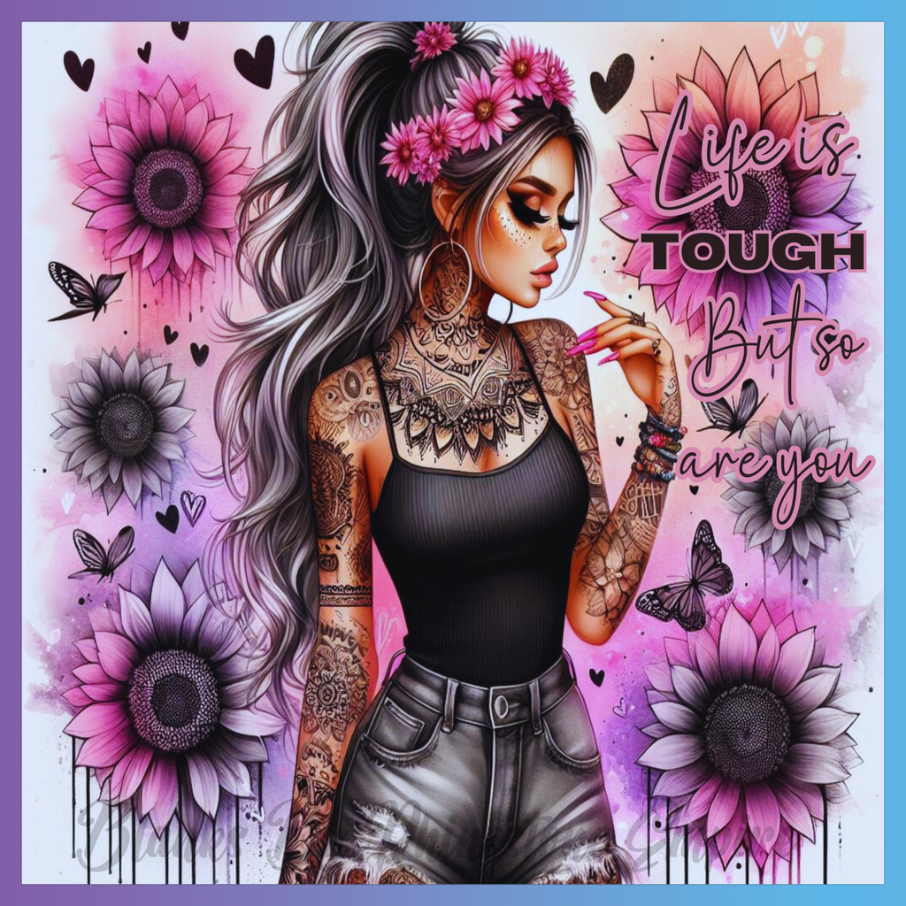 Theme: Girl with tattoo, flowers, butterflies, pink.