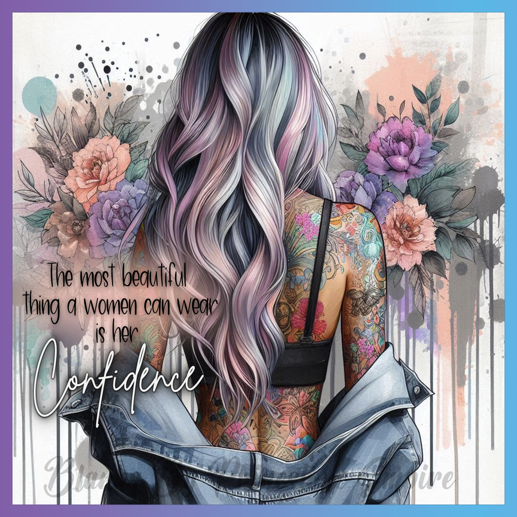 Theme: Girl with tattoo, hair, flowers, confidence.