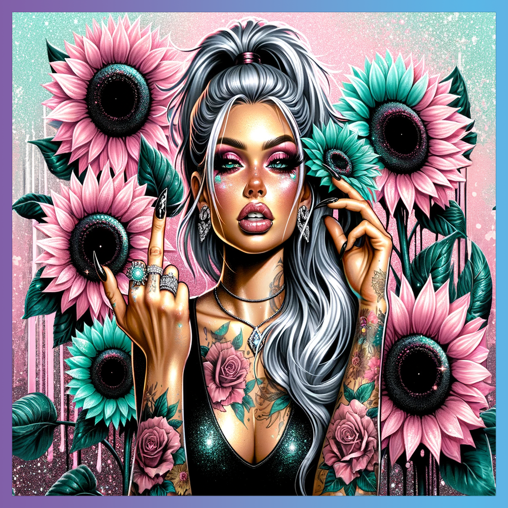 Theme: Girl with tattoo, flowers, colorful, portrait.