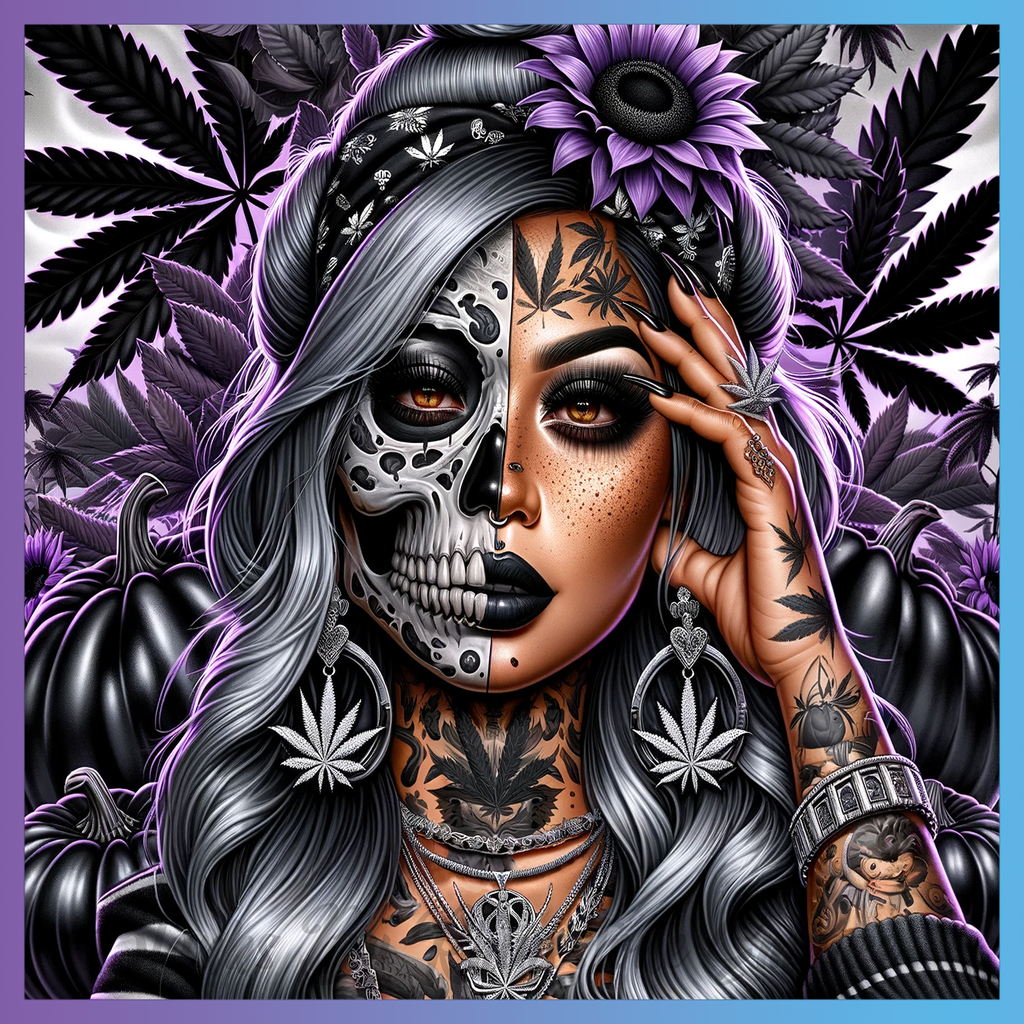Theme: Girl with tattoo, skull, flowers, cannabis.