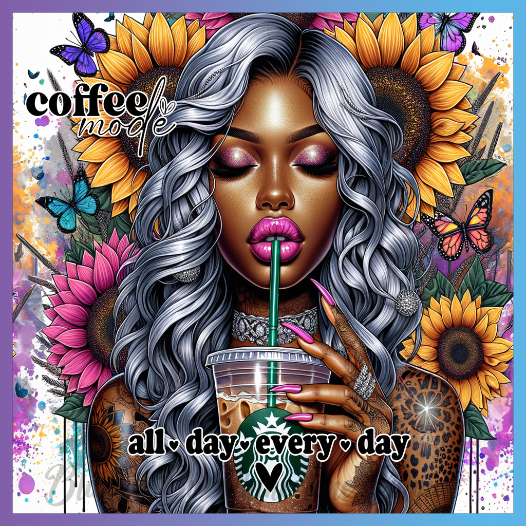 Theme: Girl with coffee, tattoo, flowers, butterflies.