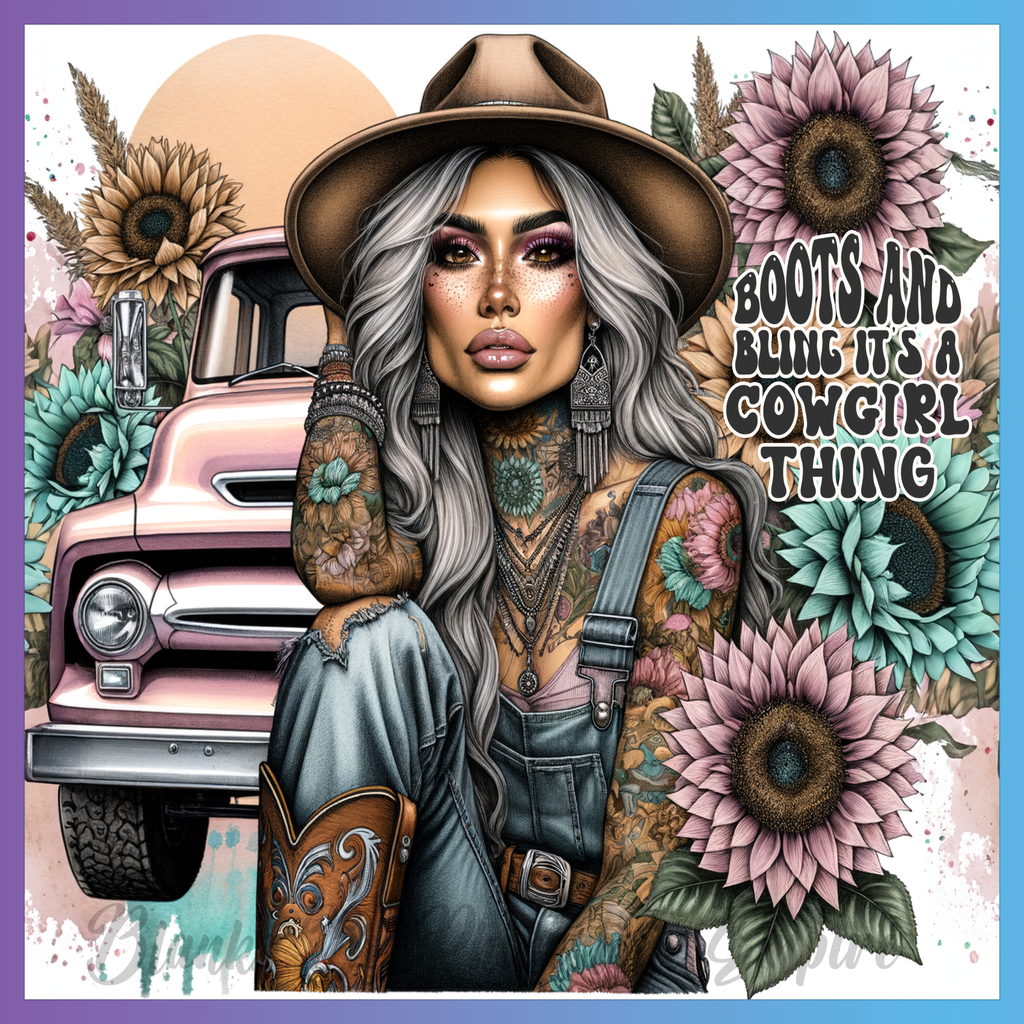 Theme: Girl with tattoo, cowgirl, flowers, pink truck.